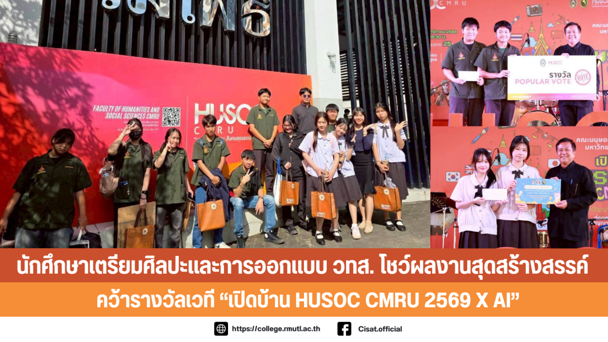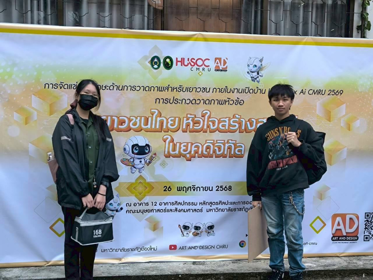 เมื่อวันที่ 26 พฤศจิกายน 2568 วิทยาลัยเทคโนโลยีและสหวิทยาการ (วทส.) มหาวิทยาลัยเทคโนโลยีราชมงคลล้านนา นำโดย อาจารย์อชิรวิชญ์ เชื้อคำ และ อาจารย์เมธปิยา คูหา ได้นำนักศึกษาชั้นปีที่ 1 และ 2 หลักสูตร เตรียมศิลปะและการออกแบบ เข้าร่วมงาน เปิดบ้าน HUSOC CMRU 2569 x AI “รากของปัญญามนุษย์ สู่อนาคตของสังคม ต่อยอดภูมิปัญญาท้องถิ่น ด้วยปัญญามนุษย์และปัญญาประดิษฐ์” จัดโดยคณะมนุษยศาสตร์และสังคมศาสตร์ มหาวิทยาลัยราชภัฏเชียงใหม่