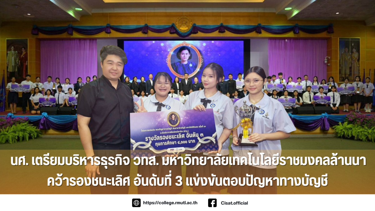 ผลการแข่งขัน ทีม PBA_CISAT_RMUTL วิทยาลัยเทคโนโลยีและสหวิทยาการ มหาวิทยาลัยเทคโนโลยีราชมงคลล้านนา ได้รับรางวัลรองชนะเลิศ อันดับที่ 3 ได้รับ ถ้วยรางวัล จาก คณบดีวิทยาลัยบริหารธุรกิจนวัตกรรมและการบัญชี (CIBA) มหาวิทยาลัยธุรกิจบัณฑิตย์ ทุนการศึกษา 4,000 บาท