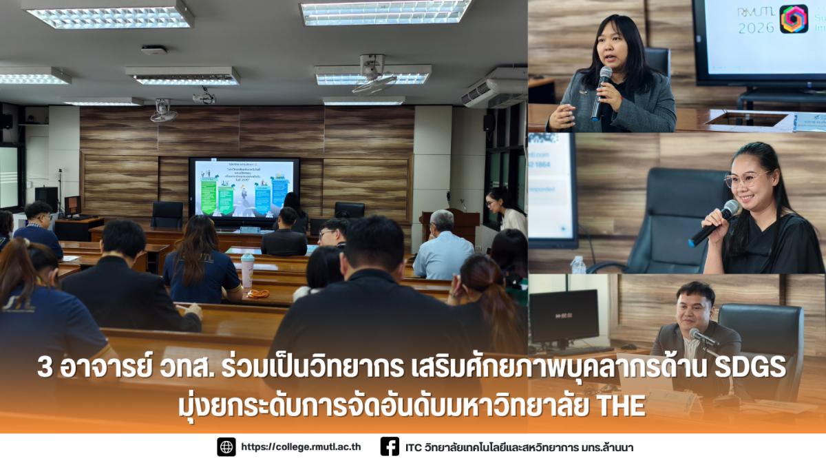 เมื่อวันพุธที่ 8 เมษายน 2569 วิทยาลัยเทคโนโลยีและสหวิทยาการ มหาวิทยาลัยเทคโนโลยีราชมงคลล้านนา นำโดย อาจารย์ ดร.ปรียา รักนิ่ม ผู้ช่วยอธิการบดีมหาวิทยาลัยเทคโนโลยีราชมงคลล้านนา พร้อมด้วย อาจารย์ ดร.รุ่งกานต์ ลีลาโสภาวุฒิ และผู้ช่วยศาสตราจารย์ ดร.อดิศร โอดศรี อาจารย์ประจำวิทยาลัยเทคโนโลยีและสหวิทยาการ ได้รับเกียรติเป็นวิทยากรในโครงการพัฒนาความรู้เรื่อง “เป้าหมายการพัฒนาที่ยั่งยืน (SDGs) ในเจ้าหน้าที่สายสนับสนุน คณะบริหารธุรกิจและศิลปศาสตร์ เพื่อการจัดอันดับที่ดีขึ้นของมหาวิทยาลัย (Time Higher Education: THE)”