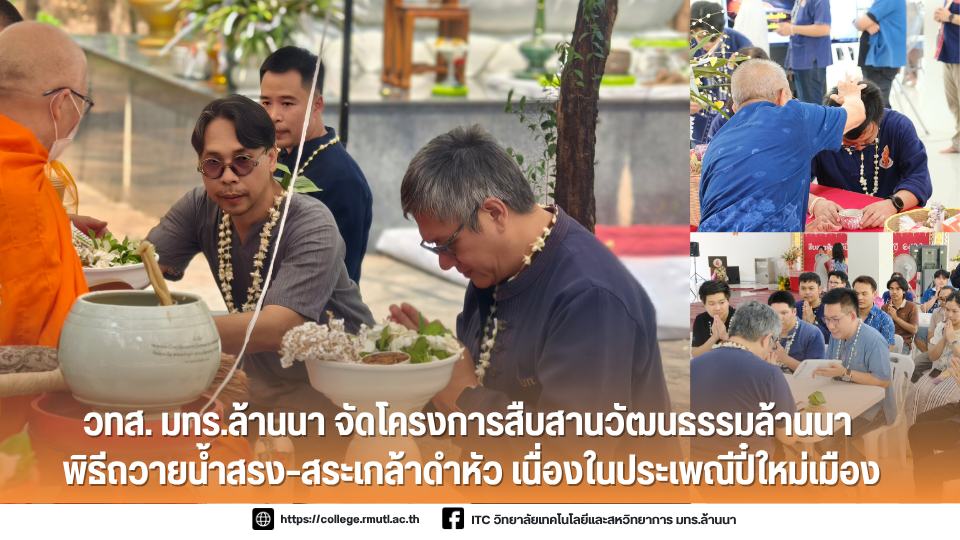 เมื่อวันที่ 24 เมษายน 2568 วิทยาลัยเทคโนโลยีและสหวิทยาการ มหาวิทยาลัยเทคโนโลยีราชมงคลล้านนา (ดอยสะเก็ด) ได้จัดโครงการ “สืบสานและถ่ายทอดองค์ความรู้พิธีถวายน้ำสรง พระพุทธมหามุนีศรีราชมงคล และสืบสานป๋าเวณีปี๋ใหม่เมือง สระเกล้าดำหัวผู้อาวุโส ผู้บริหาร และครูบาอาจารย์” ณ มณฑลพิธีประดิษฐานองค์พระพุทธมหามุนีศรีราชมงคล และโถงชั้น 1 อาคาร S1